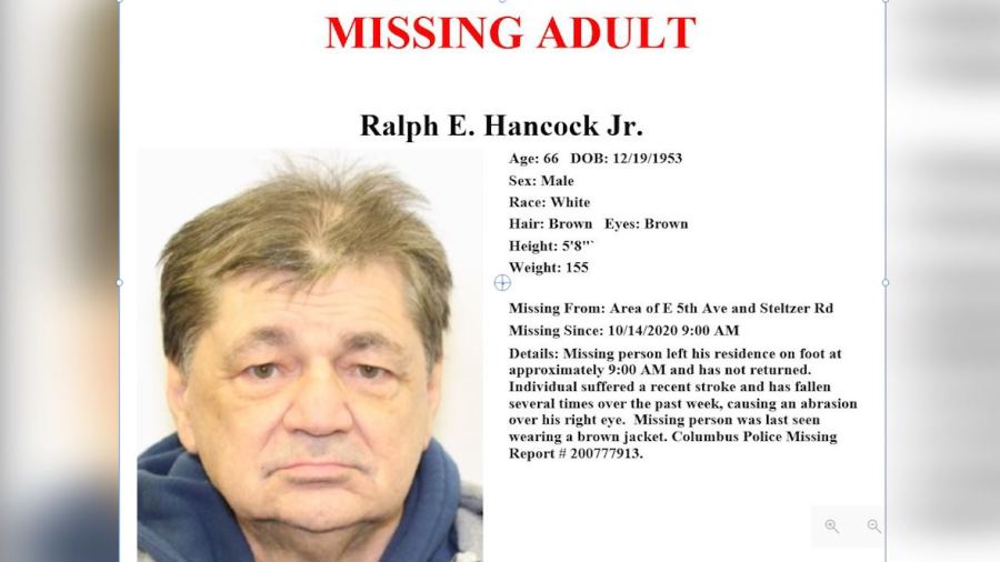 Hancock recently suffered a stroke and has fallen several times during the past week, causing an abrasion over his right eye. Hancock was last seen wearing a brown jacket. Anyone with information is asked to call (614) 645-2358.