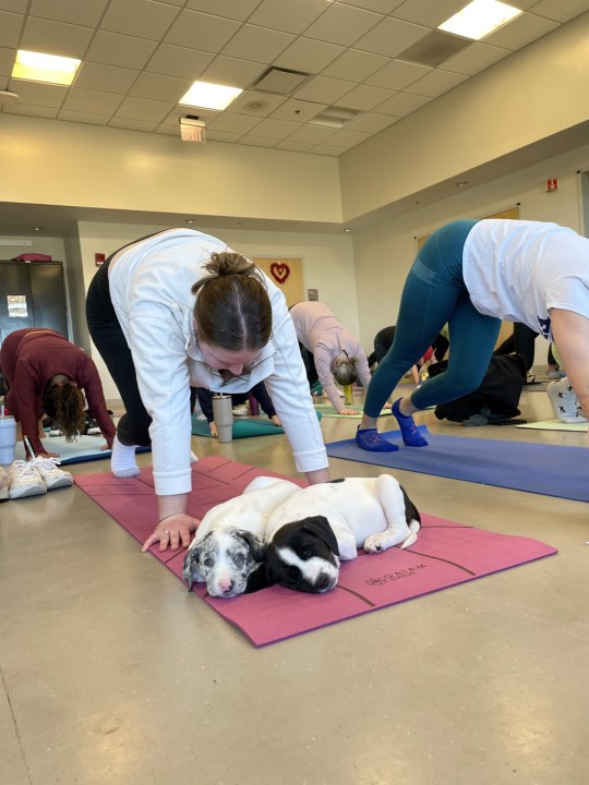 At eight weeks old, the dogs were the draw of Sunday’s sold-out puppy yoga at the shelter and ended with all the dogs being adopted.
