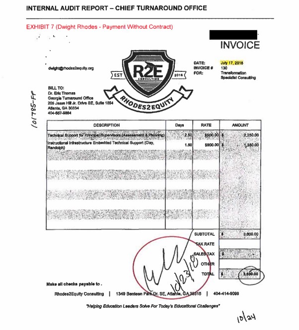 Rhodes, who was contracted to perform “the same roles and functions” as the office’s district transformation specialists, ended his first contract in June 2018 and began his second that August. For the second contract, Rhodes first billed Thomas $3,600 on July 17, according to a copy of the invoice.