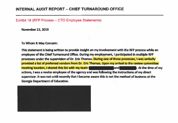“I was verbally provided a list of preferred vendors from Dr. Eric Thomas,” the leader of the evaluation committee wrote to investigators. “At the time of my actions, I was a novice employee of the agency and was following the instructions of my direct supervisor. It was not until recently that I became aware this is not the method of business at the Georgia Department of Education.”