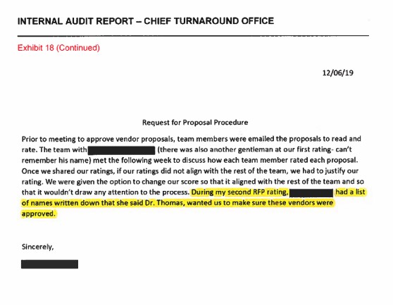 Thomas also said in his response to the audit that he disclosed any prior relationships with vendors and that he knew “nearly half of the 20 organizations that submitted bids.”
