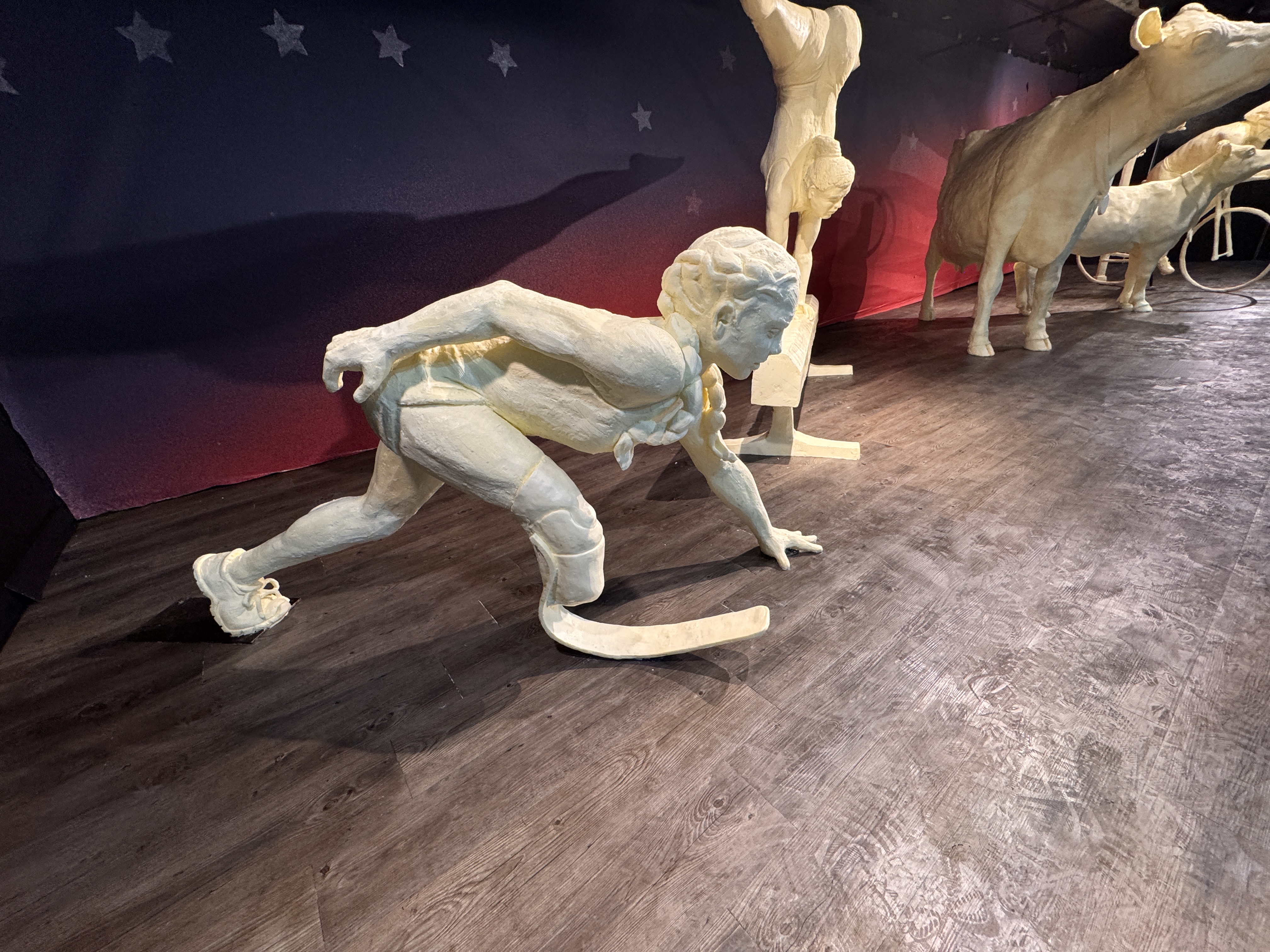The display is made with about 2,000 pounds of butter, showcasing the iconic butter cow and calf with butter-sculpted medals. Along with the cow and calf, visitors can catch life-size butter sculptures of a track and field para-athlete, a gymnast doing a handstand on the balance beam, a high-jumper and a cyclist.