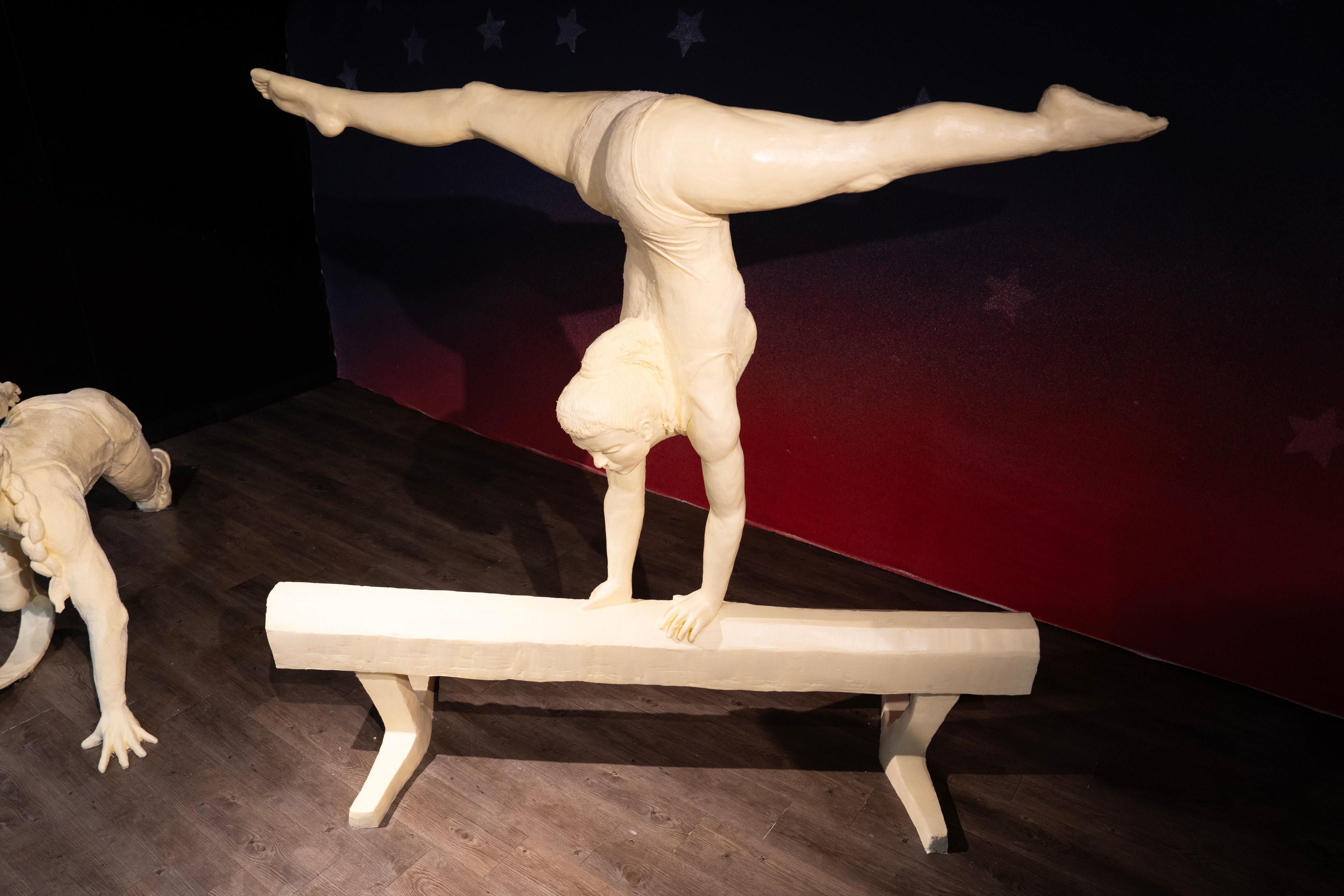 Included in this year’s butter cow display at the Ohio State Fair is a life-size butter sculpture of an elite gymnast balancing on her hands on a balance beam.
