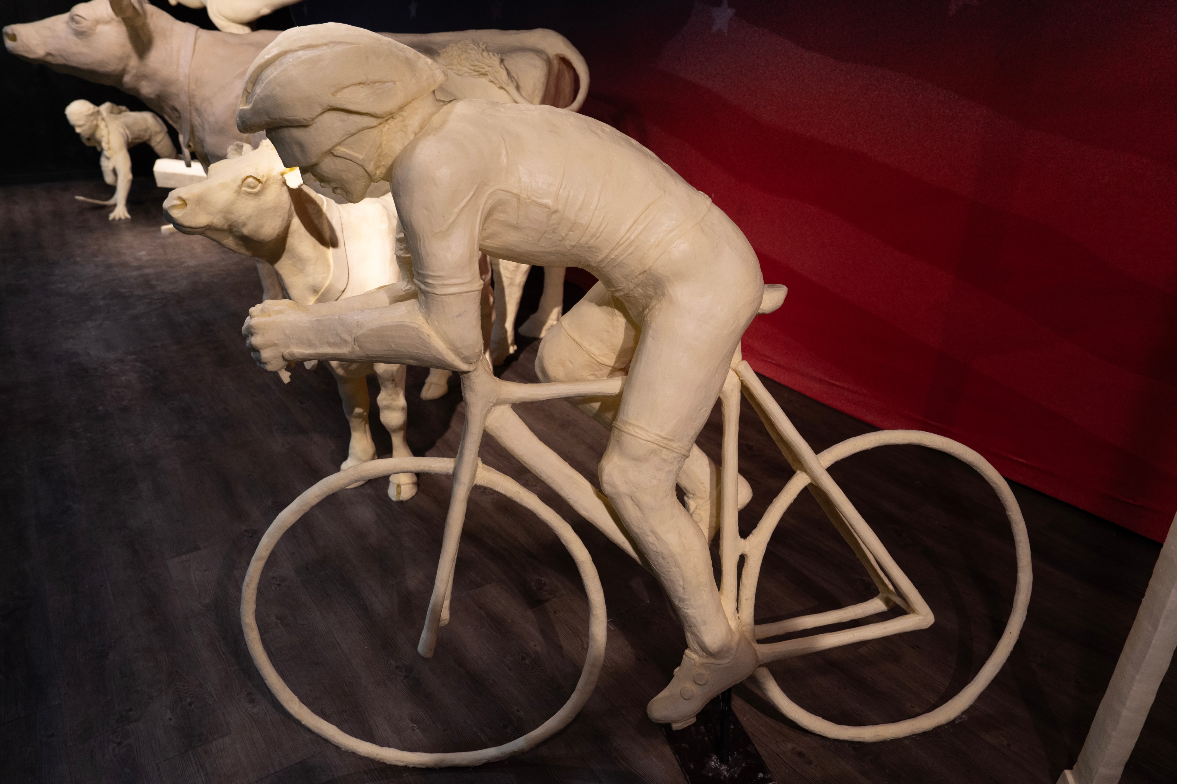 A life-size butter sculpture of a cyclist is included in this year’s butter cow display at the Ohio State Fair. Sculptors built a hidden armature to convey the motion of the cyclist leaning to the side as he rounds a curve.