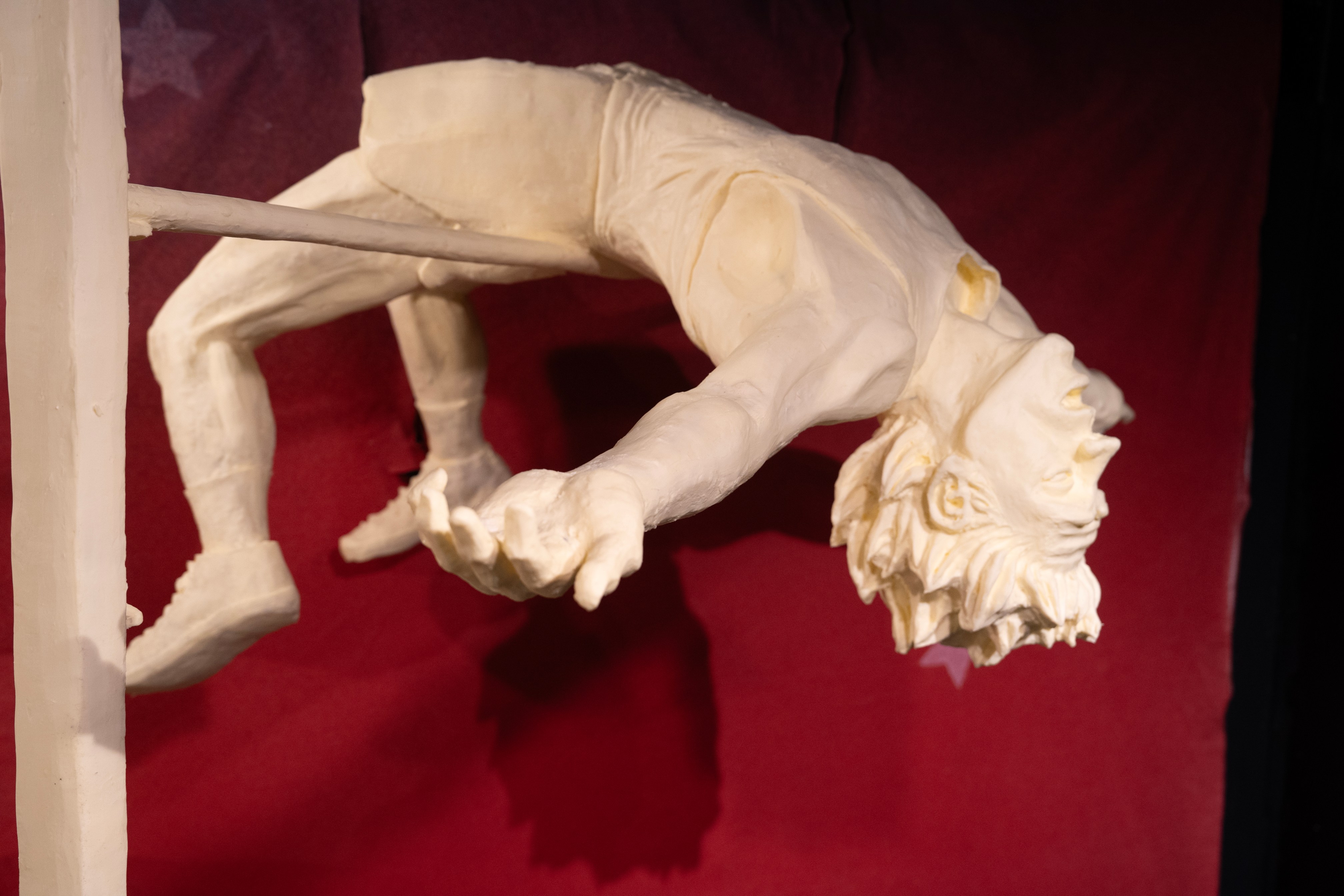A high jumper clearing the bar is sculpted in butter in this year’s butter cow display at the Ohio State Fair. The sculpture is actually anchored to the ceiling of the butter cooler so it appears the athlete is jumping over the bar.