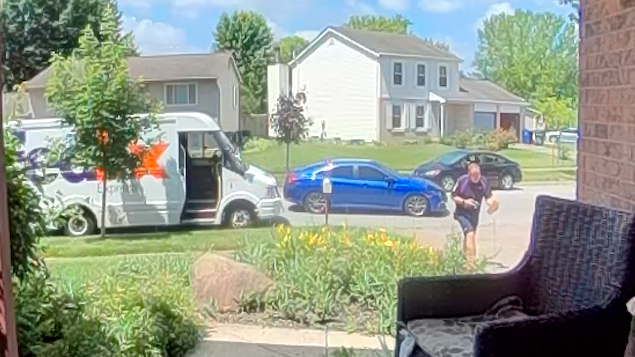 As Dorsch walked toward his front door to get his delivery, his doorbell security camera was rolling too. As the delivery driver walked up the driveway, the camera also captured a blue car stopping by the house.