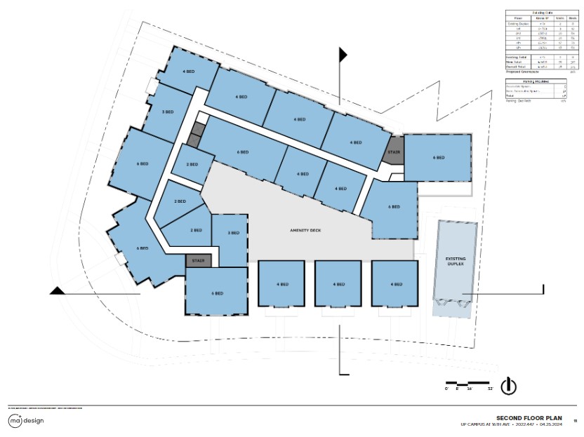 According to building plans, the five-story complex would house more than 300 residents in 78 units. Preliminary floor plans show a parking garage, lobby, fitness center and “clubroom” comprising most of the first floor. Second floor sketches show around 20 rooms on each floor, holding between two and six beds apiece.