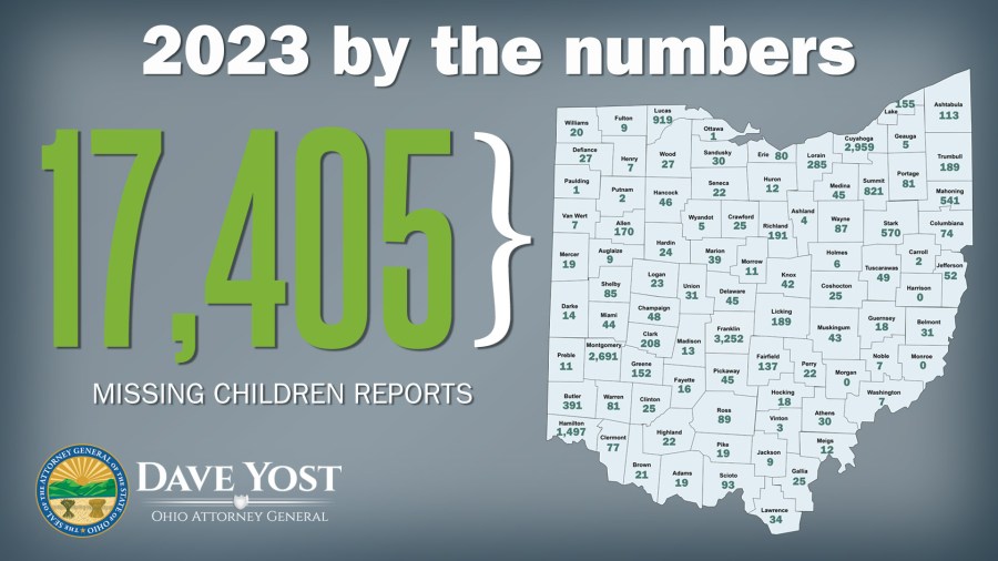 In its report for 2023 issued by the Ohio attorney general, the clearinghouse documented 22,374 people went missing in Ohio; an increase of 1,757 people compared to the year prior. Of the missing people, 17,405 were missing children — 1,850 more than the state saw in 2022.