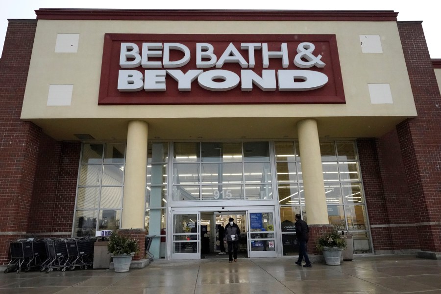 FILE - Shoppers enter and exit a Bed Bath & Beyond in Schaumburg, Ill., Jan. 14, 2021. Struggling Bed Bath & Beyond warned on Thursday that there's substantial doubt about the company's ability to continue as a "going concern" even as it continues to look at options like refinancing its debt or restructuring its business in bankruptcy court. (AP Photo/Nam Y. Huh, File)
