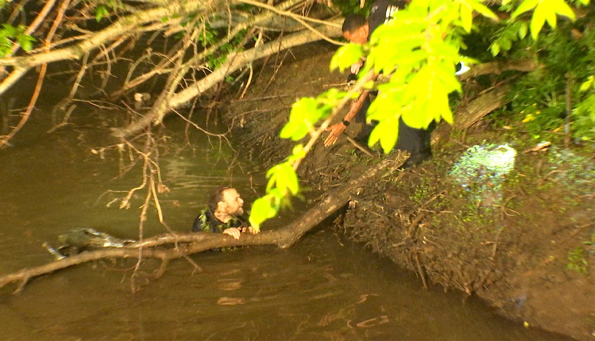 Rescue teams found Garber clinging to a tree branch near the bank of the creek. About an hour after the attempted traffic stop, he was pulled out of the water and treated for minor injuries before his arrest.