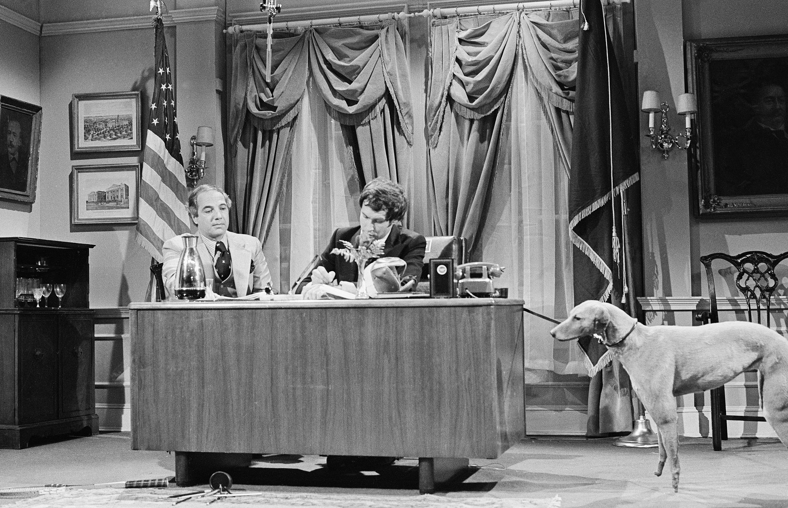 SATURDAY NIGHT LIVE — Episode 17 — Air Date 04/17/1975 — Pictured: (l-r) Ron Nessen, Chevy Chase as President Gerald Ford during “An Oval Office” skit on April 17, 1975 (Photo by NBCU Photo Bank/NBCUniversal via Getty Images via Getty Images)