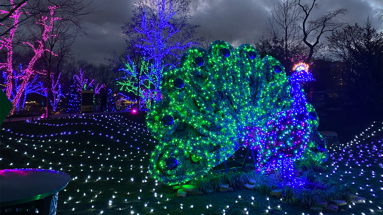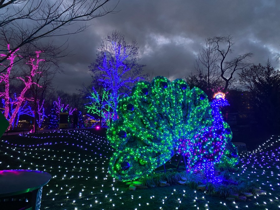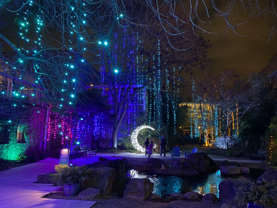 Conservatory Aglow is open during the evening and requires special engagement admission. Guests make their way through the gardens decorated with themed light displays. This year’s exhibition features several new displays, including the light show in the rainbow tunnel, a disco dance party, and a musical light show in the Grand Mallway. Returning favorites include the ornament trees, the Whirly Tree, and a larger-than-life gingerbread house.
