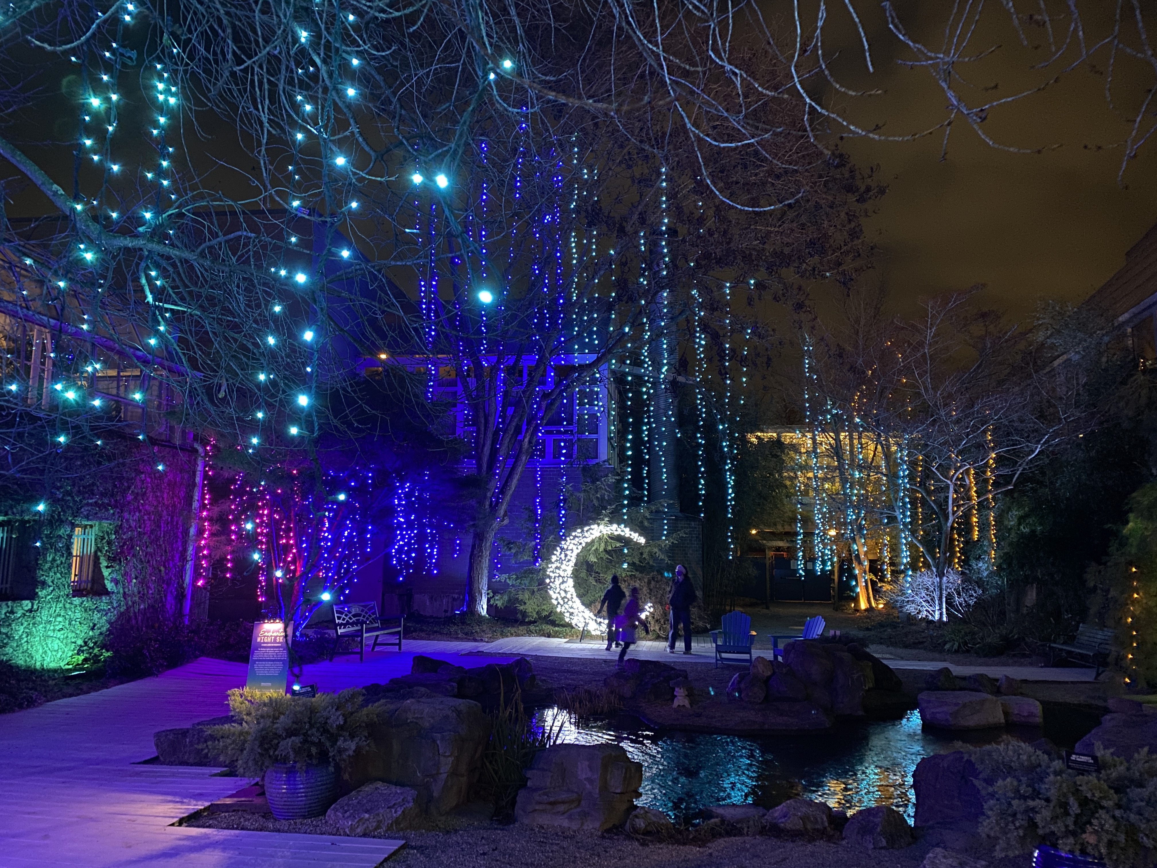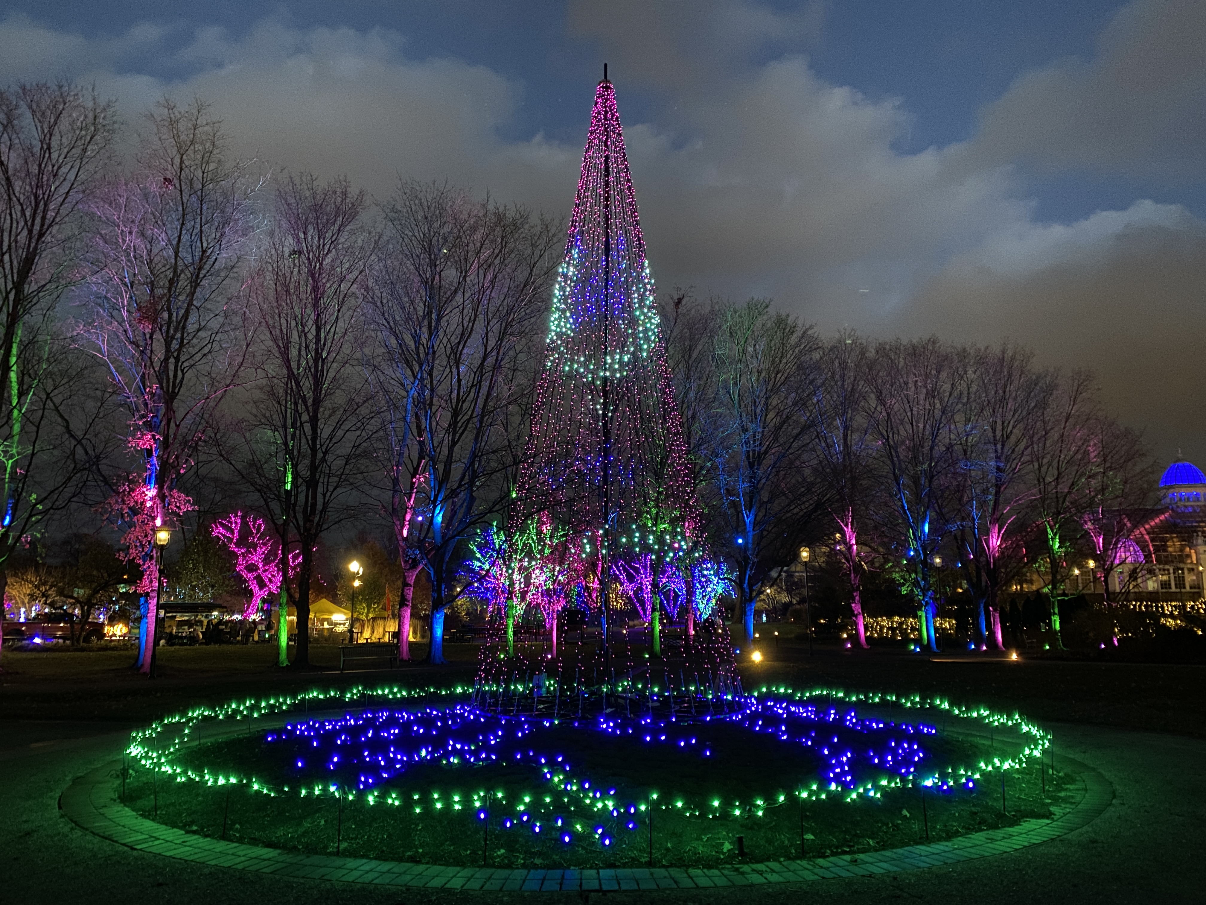 Conservatory Aglow is open during the evening and requires special engagement admission. Guests make their way through the gardens decorated with themed light displays. This year’s exhibition features several new displays, including the light show in the rainbow tunnel, a disco dance party, and a musical light show in the Grand Mallway. Returning favorites include the ornament trees, the Whirly Tree, and a larger-than-life gingerbread house.
