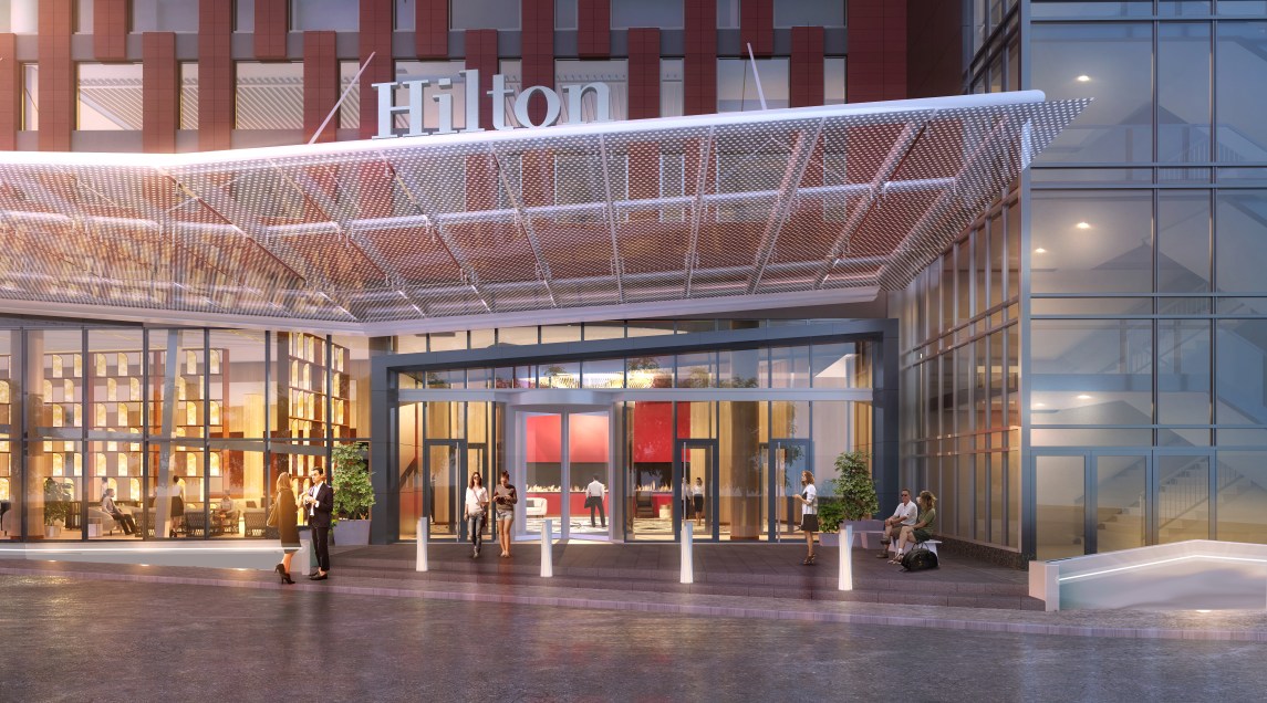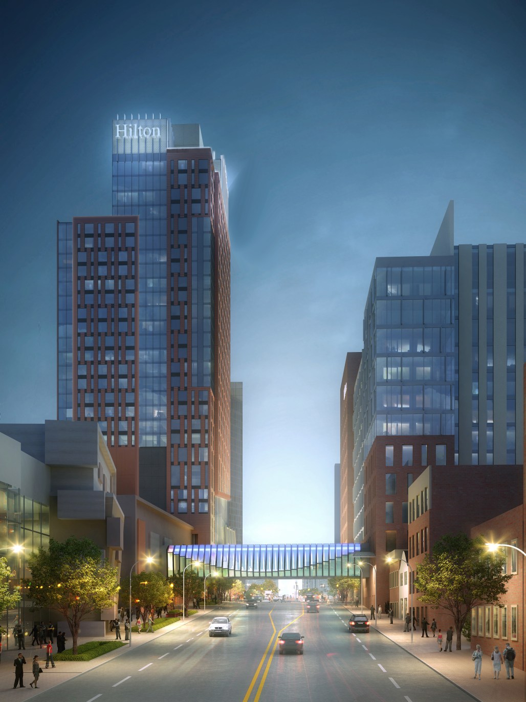 At 402 N. High St., the expansion tower of the Hilton Columbus Downtown sits in a cross-section of the city’s busiest neighborhoods on any given weekend: Downtown, Short North and Arena District. It also sits across the street from the original Hilton Columbus Downtown that opened a decade ago. The two will be connected by a sky bridge.