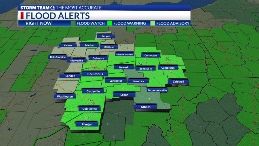 The NWS has issued flood watches and warnings for over a dozen counties in central Ohio. Alerts remain in the following areas: