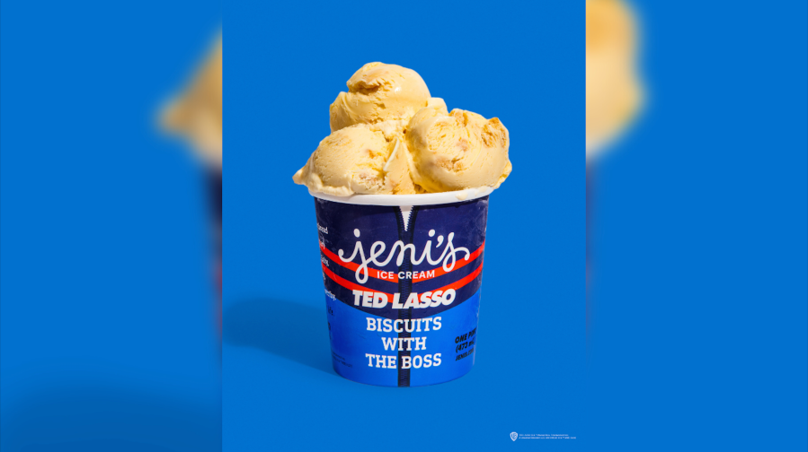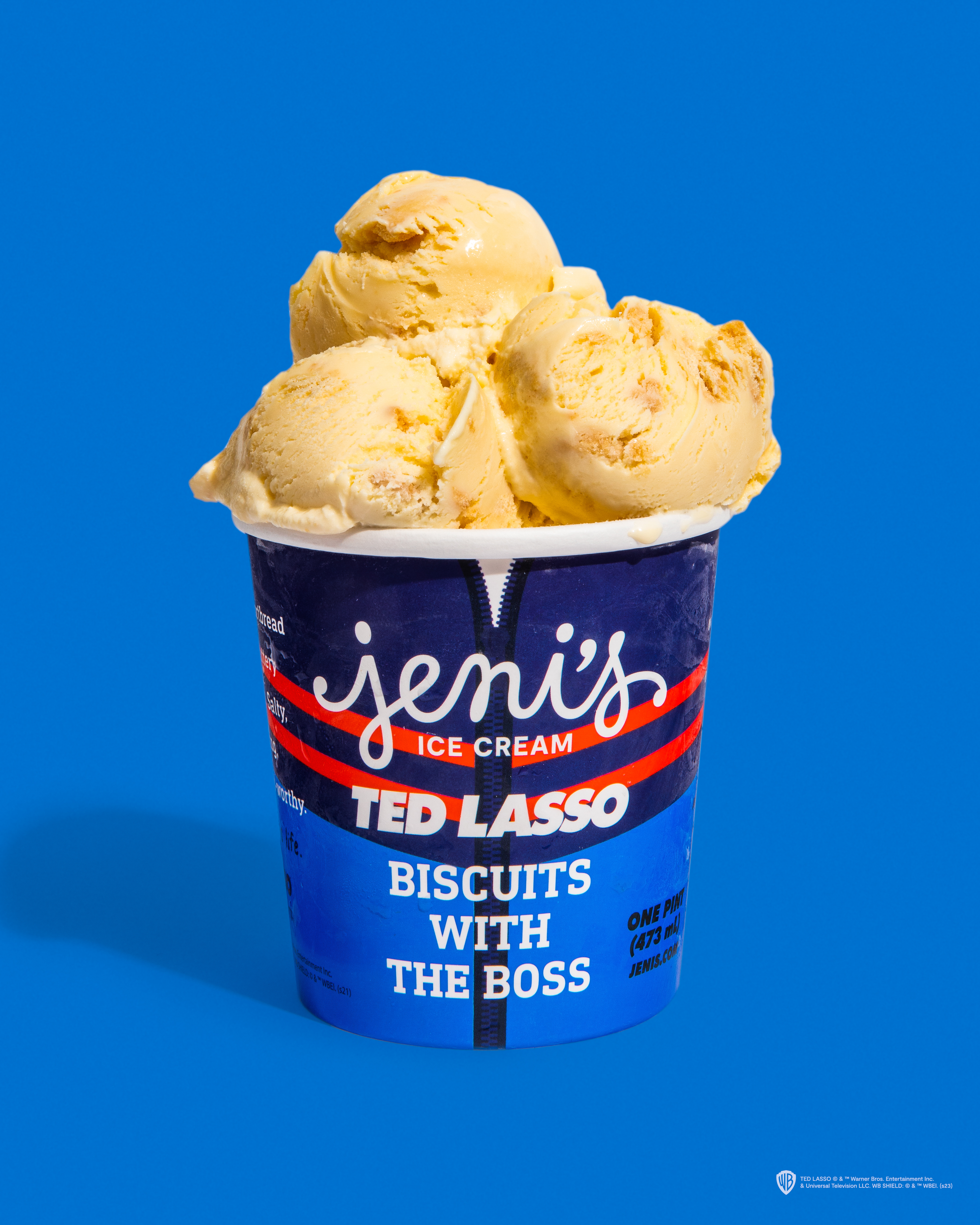 Jeni’s limited-time “Biscuits with the Boss” is available beginning Thursday in scoop shops nationwide and online for shipping here. “Ted Lasso” season three starts streaming on March 15.