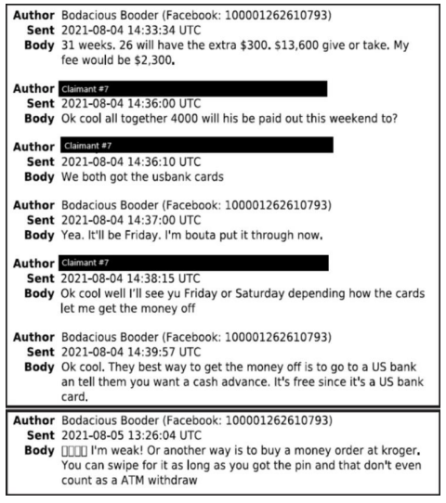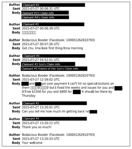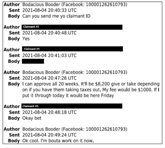 Facebook Messenger conversations between Shepard’s “Booder” account and multiple claimants that investigators obtained through a search warrant illustrate how the suspect would alter the benefits claim and also profit off of the service.
