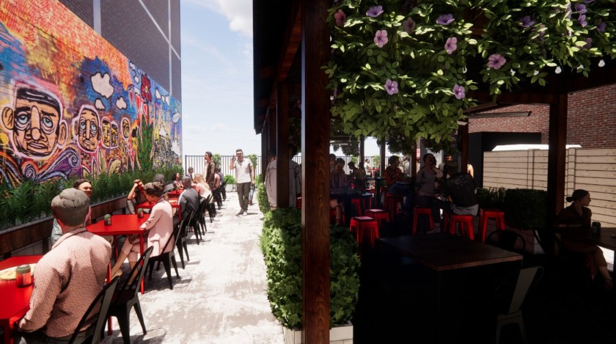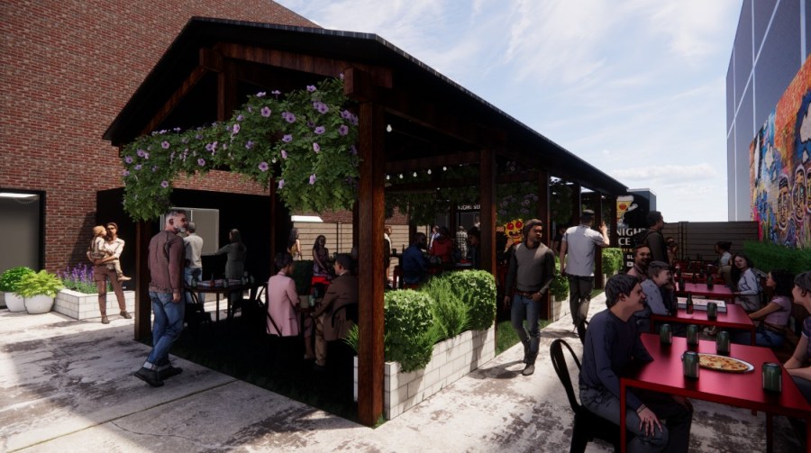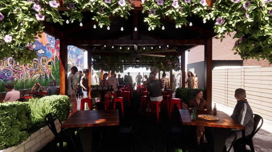 Foot traffic will move around the patio’s centerpiece: A wood-framed and steel-roofed pergola-type structure, shielding rows of high-tops from sun and rain. Concrete planters around the pergola’s perimeter will both liven the space and serve as natural barriers between the seating area and the flow of traffic.