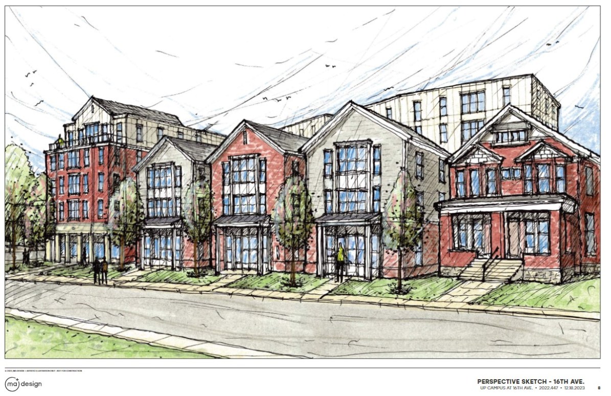 What was originally supposed to be a 425-bed complex sitting atop the slight hill the church currently occupies now includes a row of markedly shorter townhomes leading up to a six-story apartment building. Now standing at 325 beds and a little over 100 parking spaces, the plans show more greenspace along the sidewalks, including the preservation of mature sycamore trees, and porches, balconies and terraces sprinkled among the apartment units.