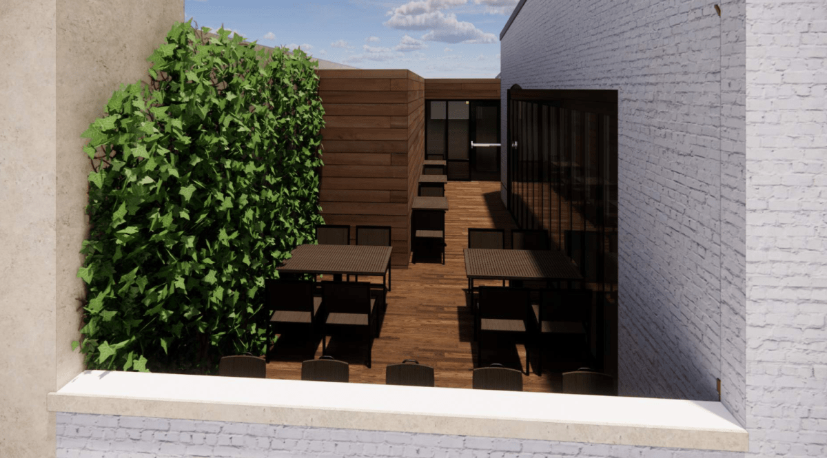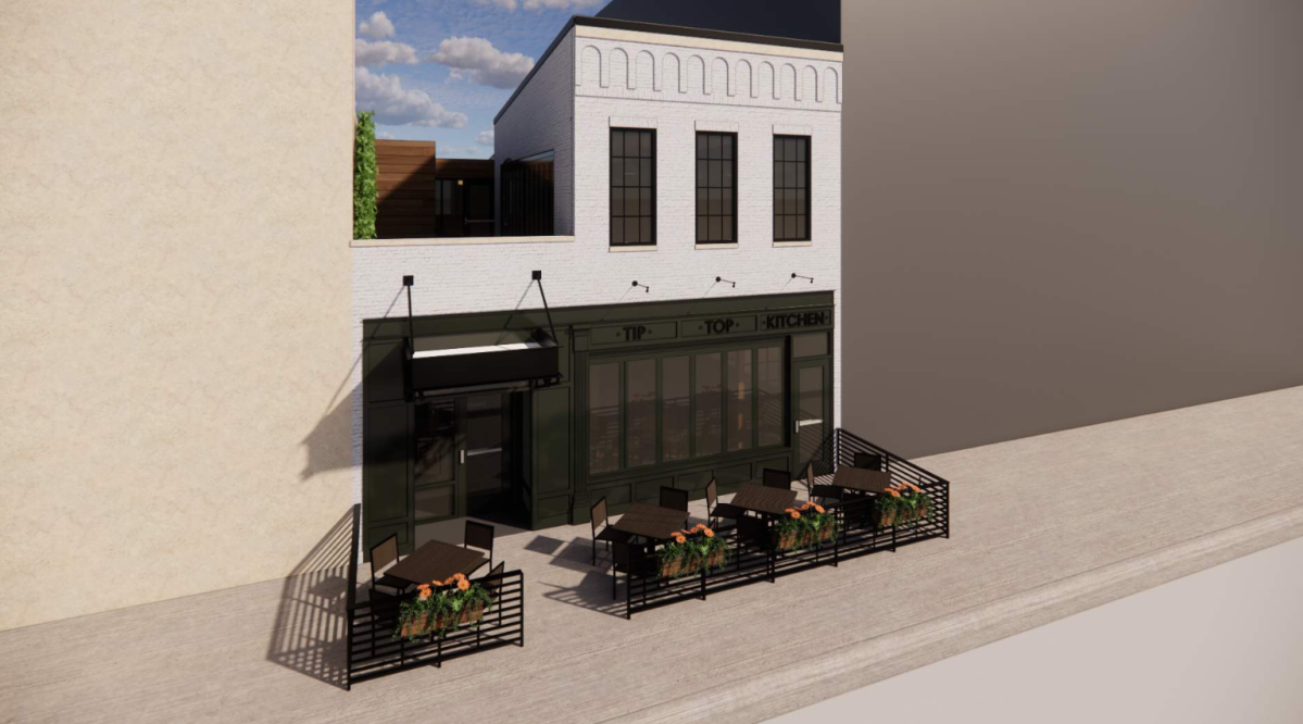 Renderings submitted to the Downtown Commission show what Tip Top’s storefront and rooftop patio would look like.