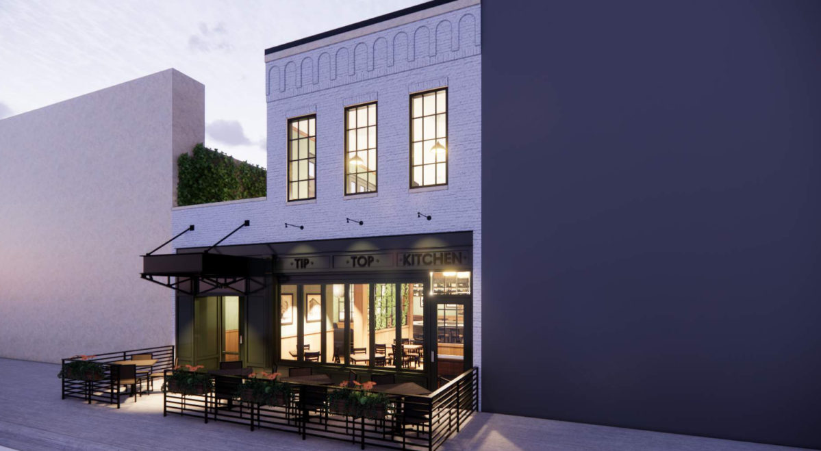 Tip Top’s partial second floor would be changed into a space with multiple uses. The removal of its current roof would make way for a rooftop patio with outdoor seating and indoor space for private dining.