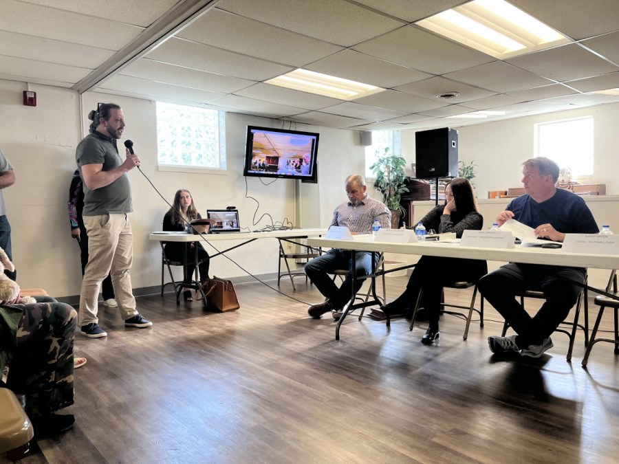 Erik Bobbitt, 35, (left) questions John C. Jordan (right) about his plans to relocate his fertilizer company to the South Side of Columbus during a community meeting at Resurrection Baptist Church on May 9, 2023. (NBC4 Photo/Maeve Walsh)