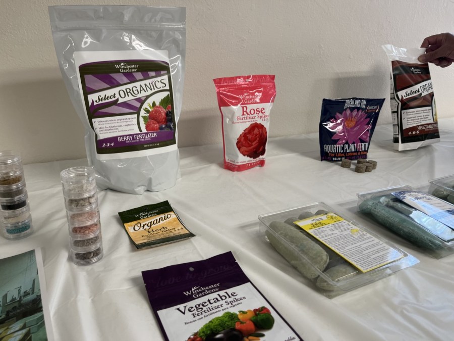 A selection of Winchester Gardens’ fertilizer products was displayed for residents at a May 9, 2023 community meeting about the company’s plan to relocate to the South Side. (NBC4 Photo/Maeve Walsh)