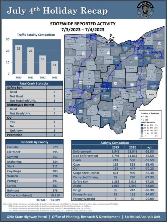 However, a document included in the OSHP release provided a statewide reported activity recap, with one chart titled “Traffic Fatality Comparison” and another titled “Activity Comparison.” The latter included stats for the years 2022 and 2023 for incidents that included crashes, OVI, suspended licenses, distracted driving, drugs, felony arrests and felony warrants issued, among others.