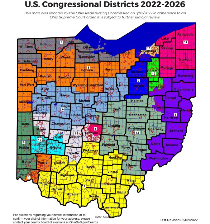 Drawn by the Republican-led Ohio Redistricting Commission, the map was found to be similar to the plan passed by the legislature and deemed unconstitutional by the Court in January, the release said. But because the Ohio General Assembly failed to pass a new plan within 30 days, the seven-member commission was required to adopt a new map, which they approved on March 2.