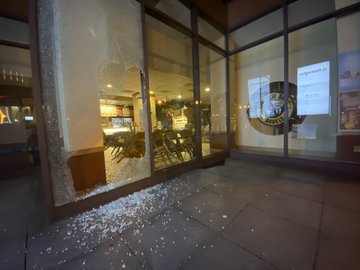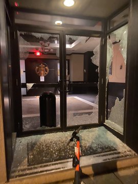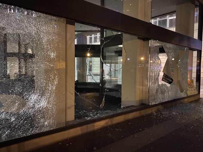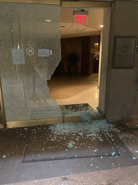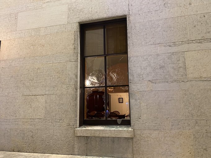 More of the damage left behind by tonight’s demonstrations downtown. One of the windows at Statehouse that was broken.