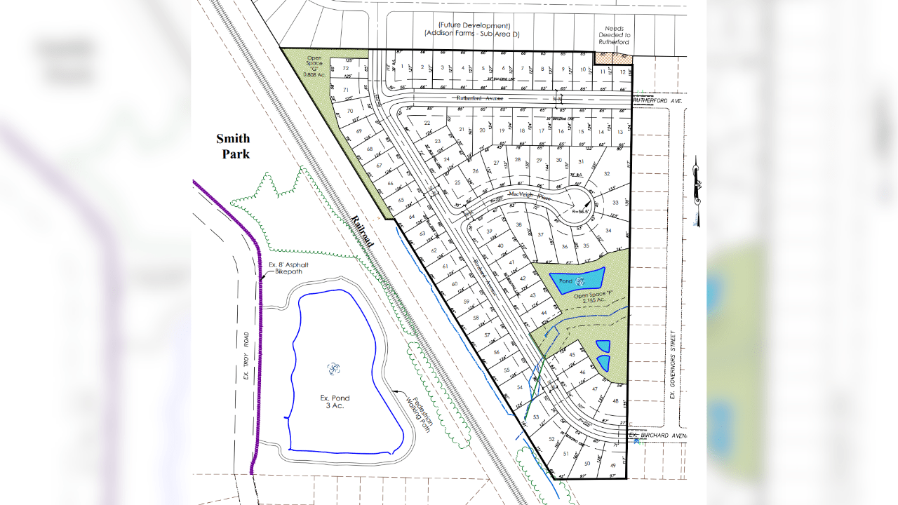 The development, referred to as “Rutherford Acres” in the proposal, will connect to the Hayes Colony subdivision to the west by extending Rutherford and Birchard avenues. Rutherford Acres will also intersect with Addison Farms’ Four Seasons subdivision, under construction to feature 49 single-family homes on 29 acres and 45 single-family homes on 11 acres.