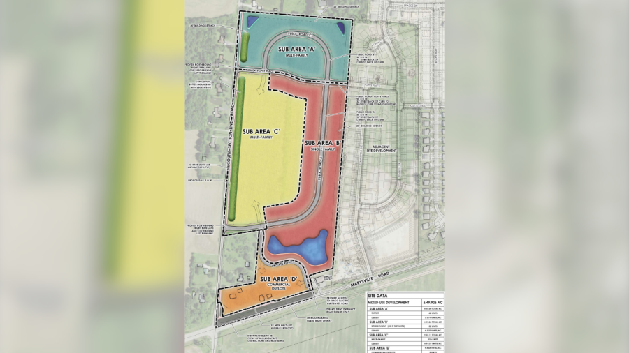 A proposal by Fincon Epic Ventures calls for the 49.9-acre Delaware site on the northeast corner of South Section Line Road and Marysville Road to be developed into four sections, each referred to as a “Sub-area” in the proposal. Areas A and C would feature multi-family housing, while Area B would include single-family housing and Area D would be dedicated to commercial space.