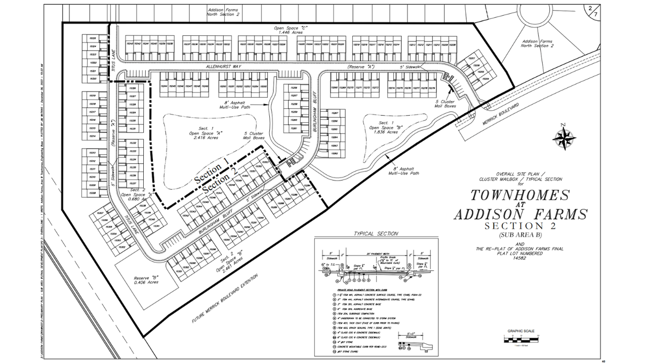The 7.2-acre Section 2 will be part of the development’s “Sub-Area B,” which will also include “Section 1” with 76 townhomes that were approved for construction earlier this year. The two sections will come together to create a townhome neighborhood in Addison Farms with 146 units.