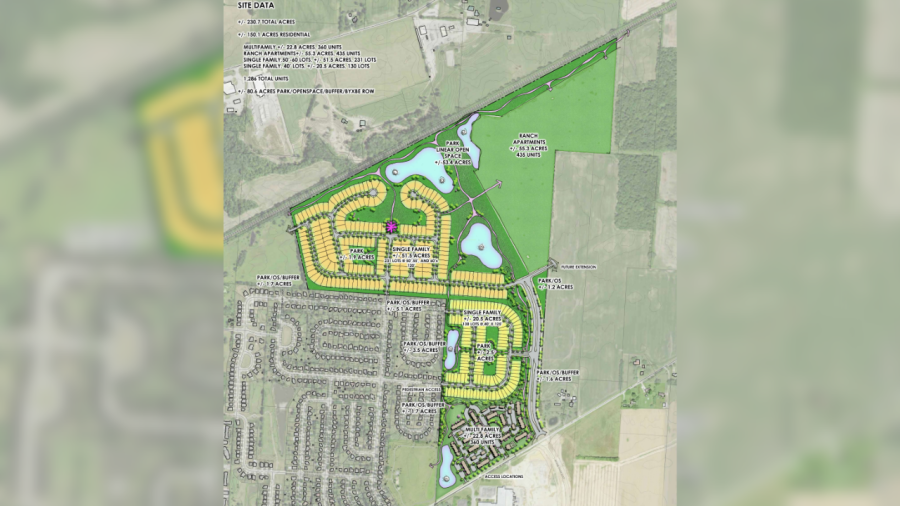The Kilbourne Road Site Plan would be home to a variety of single-family detached and multi-family homes on the 230-acre site, including 55 acres of about 435 ranch-style apartments and 22 acres of about 360 multi-story apartments.