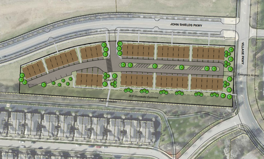Plans call for the homes to be constructed fronting toward green space, with each home’s first-level garage accessible through a private road off of John Shield Parkway. The 55 single-family units would range from 2,097 to 2,274 square feet with three to four bedrooms and two to four bathrooms.