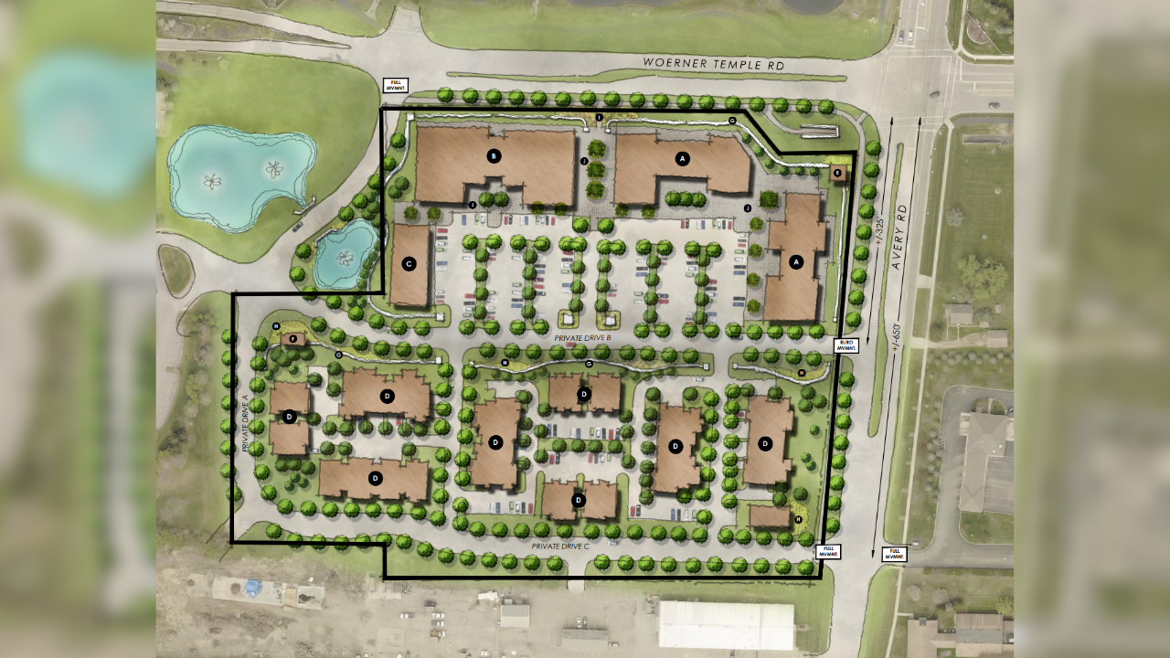 Stavroff Land and Development aims to transform a 12-acre site southwest of the intersection of Avery and Woerner Temple roads into a mixed-use district named “Irish Village.” The village would sit next to the Ballantrae Community Park and the Dublin Community Pool, sporting the Ballantrae neighborhood’s Irish countryside-inspired aesthetic.