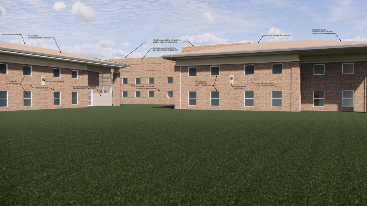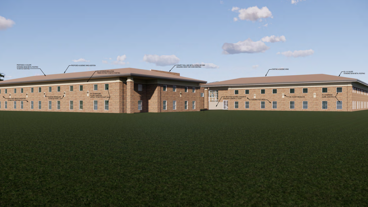 Once completed, the academic wing will span 56,000 square feet and be located on the building’s north side, between the two existing two-story academic wings. The proposal said the new wing will be home to 27 new classrooms accommodating about 25 students each, and other supporting spaces.
