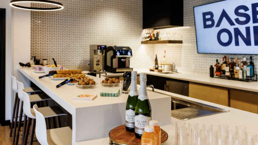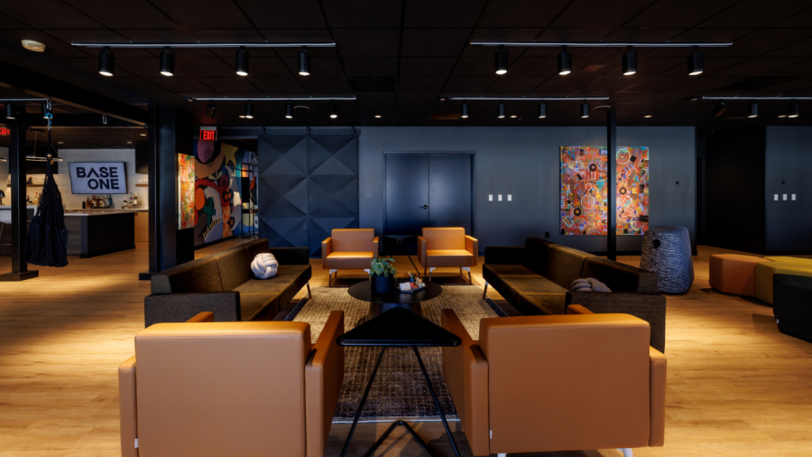 Base One will also be home to a café and bar with complimentary Crimson Cup drip coffee, water and small bits from Krema Nut Co. Made-to-order café drinks and cocktails will