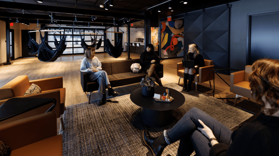 The idea room is equipped to handle whiteboard sessions and multimedia presentations for groups of 10 or less. The on-air studio is acoustically optimized for creators and influencers to produce podcasts and audio recordings, while photographers and videographers can utilize the
