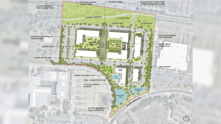Columbus-based developer Pizzuti is proposing a series of apartment buildings on 18.9 vacant acres on Blazer Parkway, between Metro Center and the Blazer Research District. The conceptual plan calls for six residential buildings totaling 330 units, an increase of 30 units from Pizzuti’s initial submittal to Dublin’s Planning and Zoning Commission.