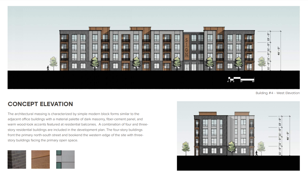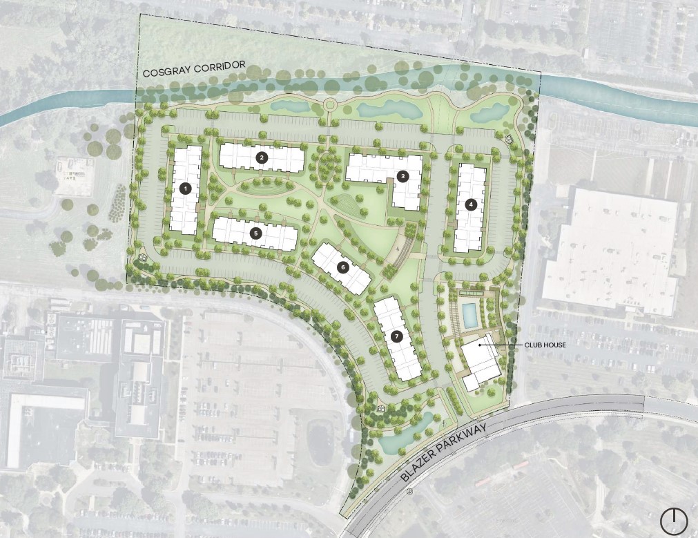 The conceptual plan calls for seven residential buildings spanning more than 338,000 square feet and a clubhouse at the entrance of the complex. Varying between three and four stories, the seven buildings would house one-bedroom and two-bedroom apartments totaling 300 units.