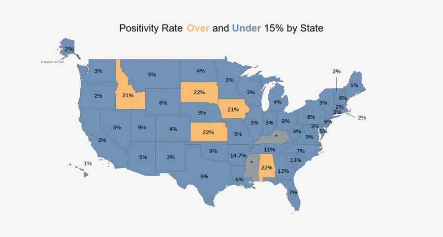 States are listed if they show a positivity rate for COVID-19 of 15 percent or higher. That rate dropped to 8 percent this week in Ohio, up from 7 percent last week.