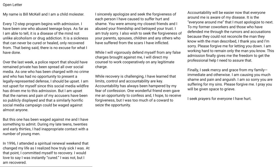 In a letter posted on his Facebook page, Bill McKell appears to acknowledge the allegations. “My name is Bill McKell and I am a child molester,” the letter begins. “Every 12-step program begins with admission. I have been one who abused teenage boys.”