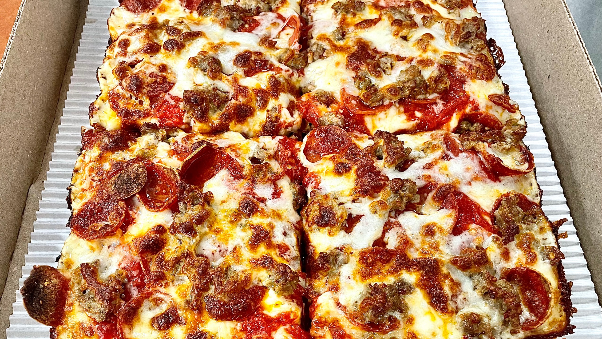 Pizza Nerds serves what Gargasz describes as his own take on Detroit-style pizza, featuring edge-to-edge cheese, sauce on top of the cheese and toppings. The pizzeria is also known for its cookies stuffed with fillings such as chocolate and icing.