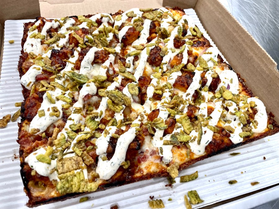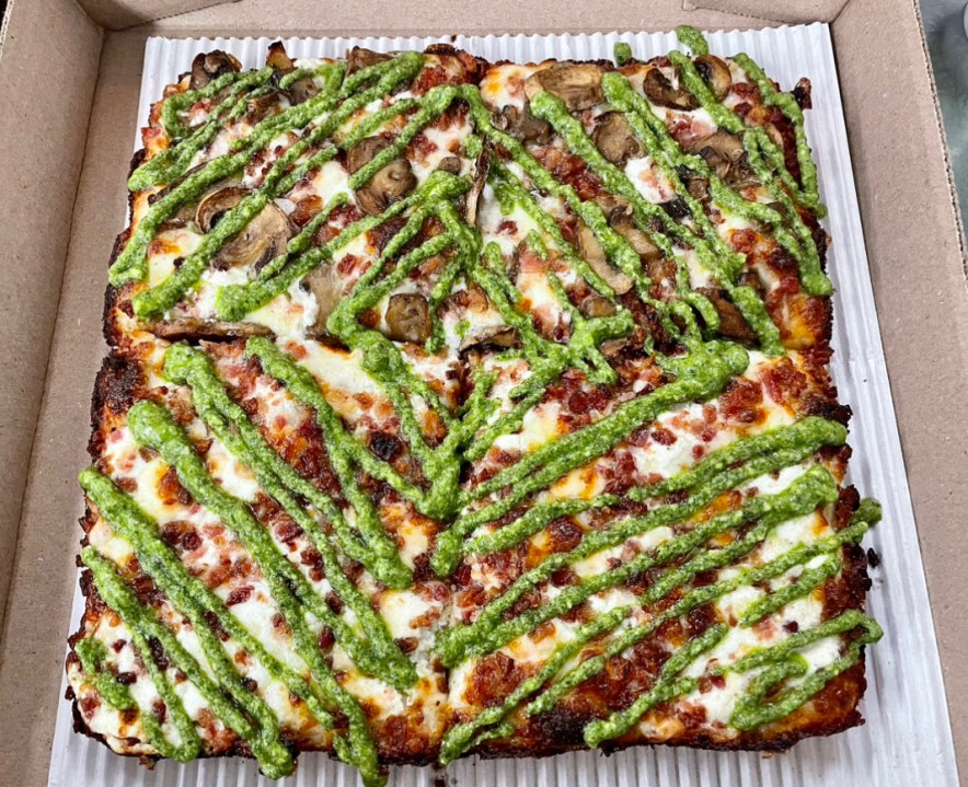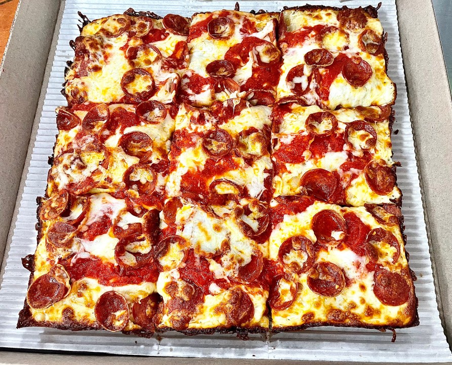 “We do sort of a Detroit-style-ish pizza, so it’s a thicker crust pan pizza,” Gargasz said. “It’s cheese the whole way, edge-to-edge, sauce on top of the cheese, toppings on top of that and then baked. So you get a little bit thicker of a pizza with a nice crispy bottom, but it’s still kind of a soft, fluffy inside of the pizza.”