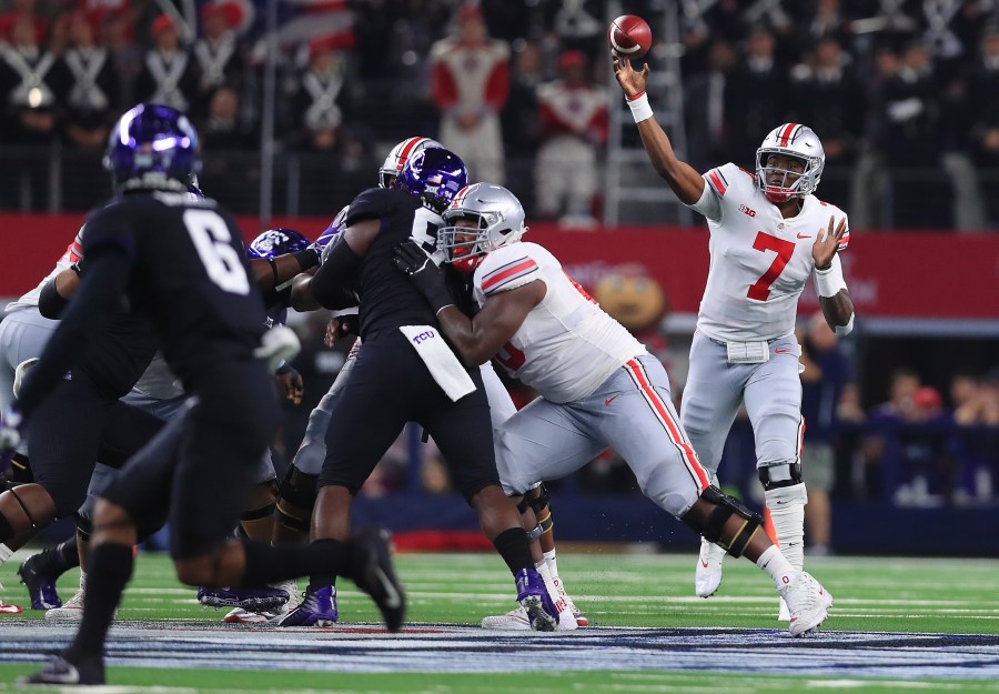 ARLINGTON, TX – SEPTEMBER 15: Dwayne Haskins #7 of the Ohio State Buckeyes looks for an open receiver against the TCU Horned Frogs in the first quarter during The AdvoCare Showdown at AT&T Stadium on September 15, 2018 in Arlington, Texas. (Photo by Tom Pennington/Getty Images)