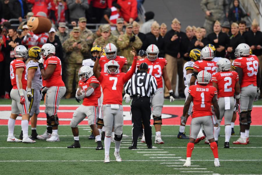 COLUMBUS, OH – NOVEMBER 24: Quarterback Dwayne Haskins #7 of the Ohio State Buckeyes celebrates with the crowd as time winds down in the fourth quarter against the Michigan Wolverines at Ohio Stadium on November 24, 2018 in Columbus, Ohio. Ohio State defeated Michigan 62-39. (Photo by Jamie Sabau/Getty Images)