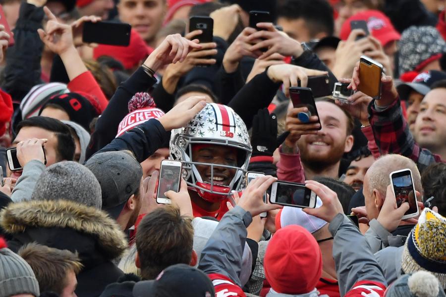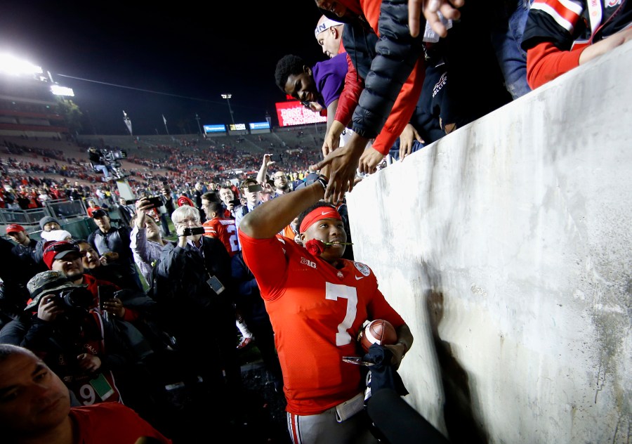 COLUMBUS, OH – NOVEMBER 24: Quarterback Dwayne Haskins #7 of the Ohio State Buckeyes is congratulated by fans as he walks off the field after defeating the Michigan Wolverines at Ohio Stadium on November 24, 2018 in Columbus, Ohio. Ohio State defeated Michigan 62-39. (Photo by Jamie Sabau/Getty Images)