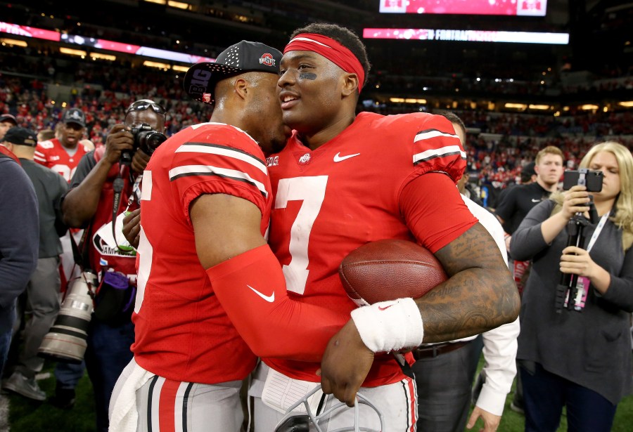 INDIANAPOLIS, IN – DECEMBER 01: Dwayne Haskins Jr. #7 of the Ohio State Buckeyes celebrates with his teammate after defeating the Northwestern Wildcats during the Big Ten Championship at Lucas Oil Stadium on December 1, 2018 in Indianapolis, Indiana. (Photo by Andy Lyons/Getty Images)