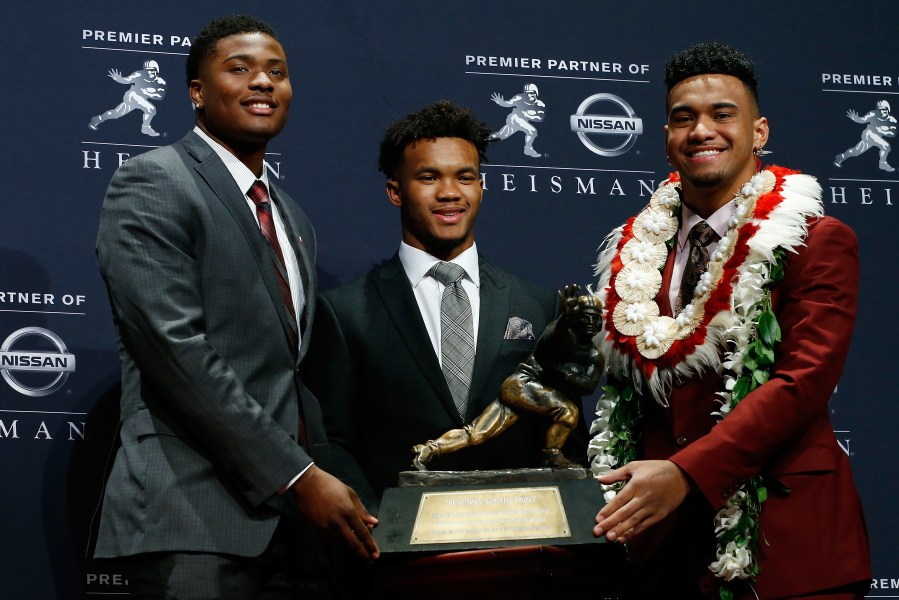 NEW YORK, NY – DECEMBER 08: Dwayne Haskins of Ohio State, Kyler Murray of Oklahoma, and Tua Tagovailoa of Alabama pose for a photo at the press conference for the 2018 Heisman Trophy Presentationon December 8, 2018 in New York City. (Photo by Mike Stobe/Getty Images)
